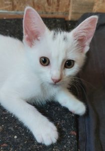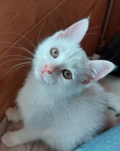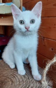 Die kleine Elsa ist zwei Wochen älter als ihre Zieh-Geschwister und aufgrund ihrer weißen Fellfarbe leider taub. Fiete und Fiona, ebenfalls weiße Kitten, hören jedoch prima!